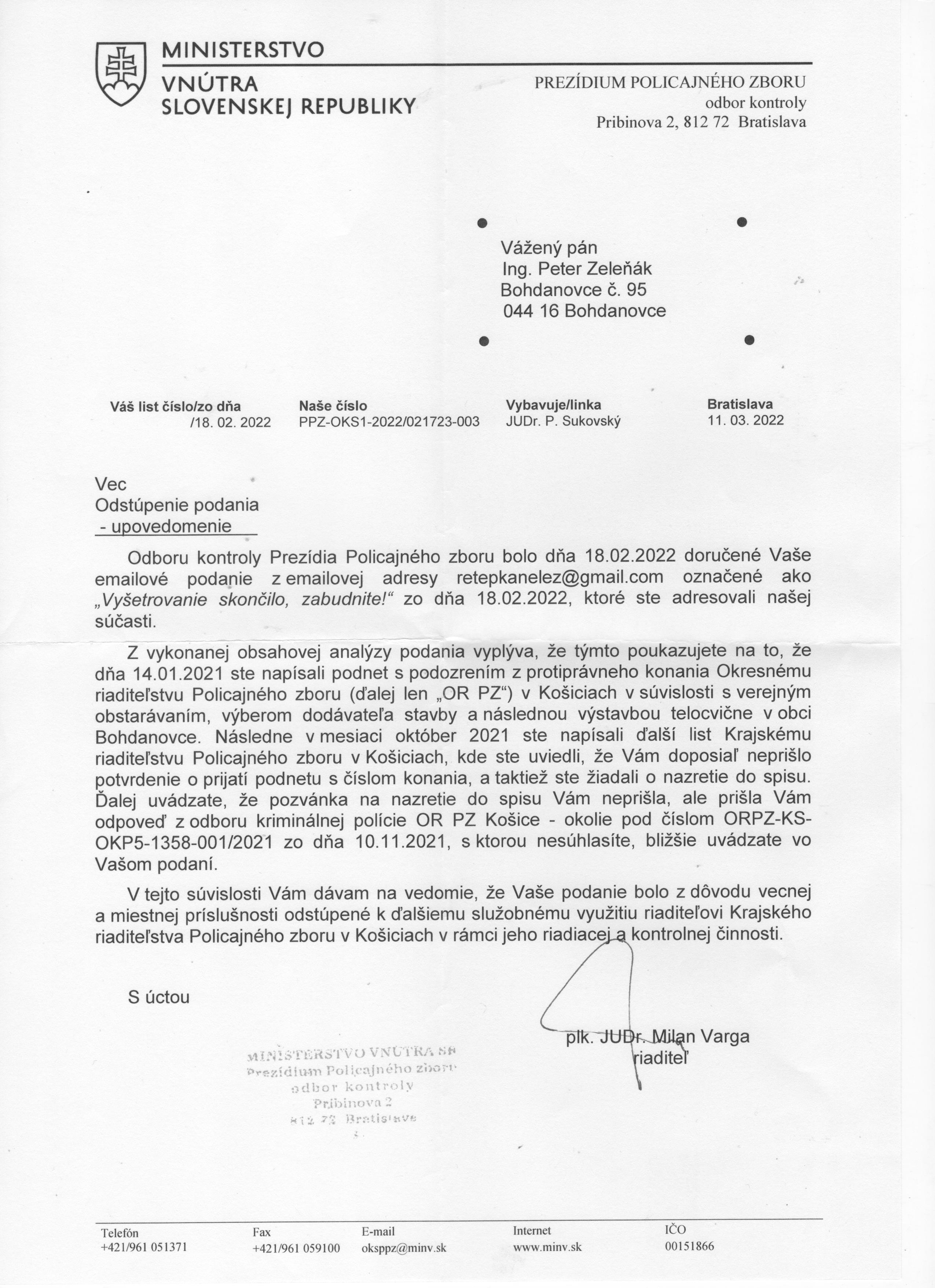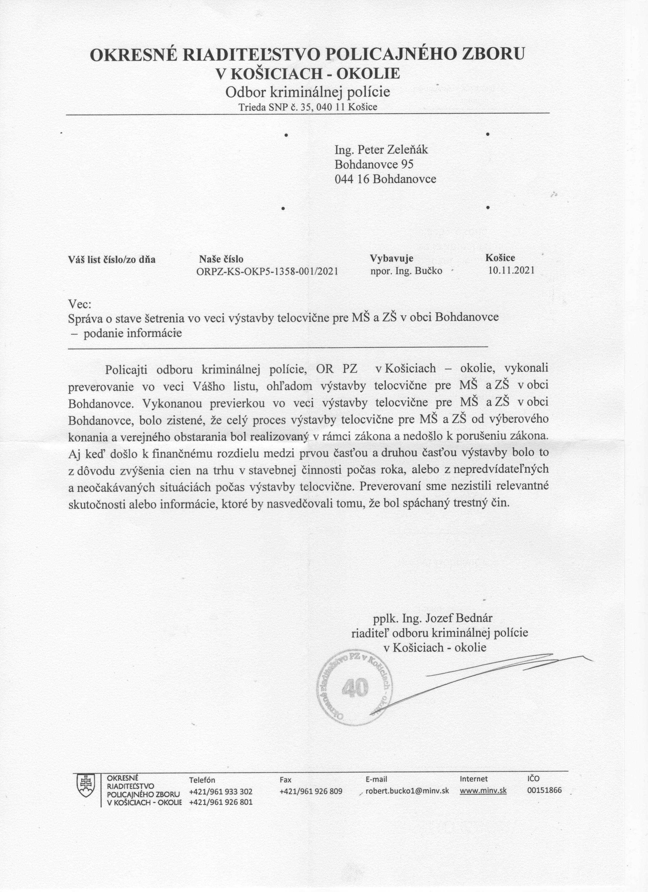 KR PZ v Košiciach Vám odstúpilo moju žiadosť o nazretie do spisu o preverovaní zákonnosti postupu pri verejnom obstarávaní na dodávateľa stavby Telocvičňa pri ZŠ s MŠ v Bohdanovciach.